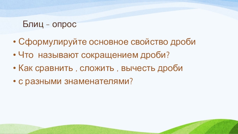 Блиц - опросСформулируйте основное свойство дробиЧто называют сокращением дроби?Как сравнить , сложить , вычесть дроби с разными