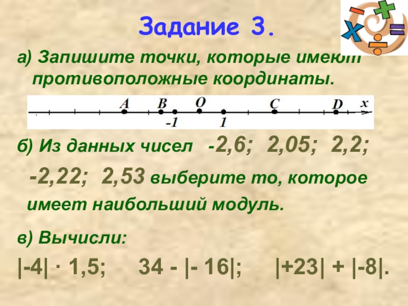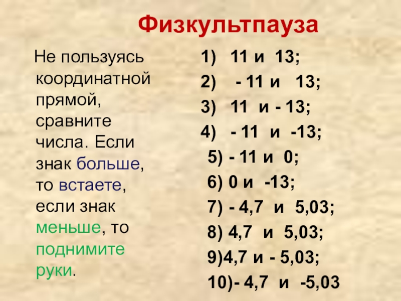 Не пользуясь координатной прямой, сравните числа. Если знак больше, то встаете, если знак меньше, то поднимите руки.