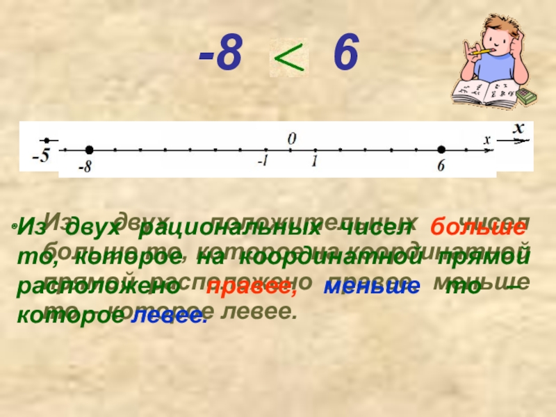 Из двух рациональных чисел больше то, которое на координатной прямой расположено правее, меньше то – которое левее.