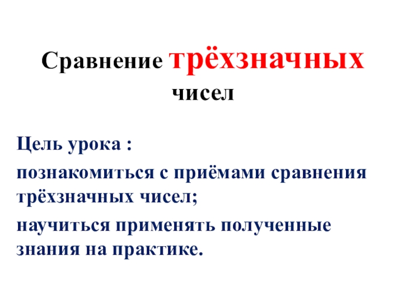 Сравнение трёхзначных чиселЦель урока :познакомиться с приёмами сравнения трёхзначных чисел;научиться применять полученные знания на практике.