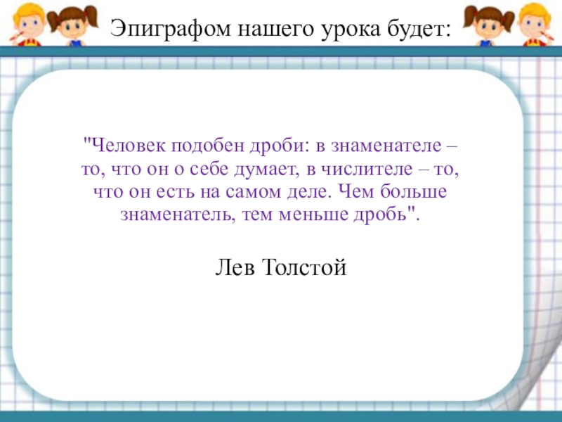 "Человек подобен дроби: в знаменателе – то, что он о себе думает, в числителе – то, что он есть на самом деле. Чем больше знаменатель, тем меньше дробь".