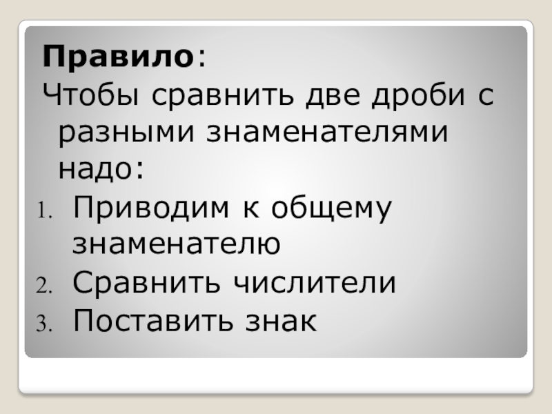 Правило: Чтобы сравнить две дроби с разными знаменателями надо:Приводим к общему знаменателюСравнить числителиПоставить знак