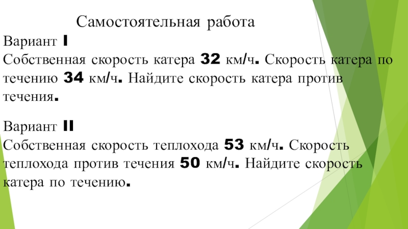 Собственная скорость теплохода 53 км/ч. Скорость теплохода против течения 50 км/ч. Найдите скорость катера по течению.