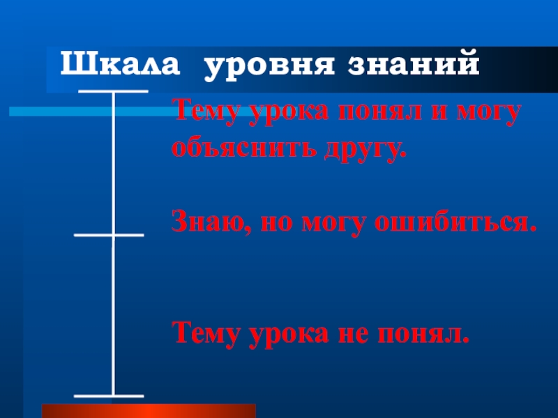 Шкала уровня знаний Тему урока понял и могуобъяснить другу.Знаю, но могу ошибиться.Тему урока не понял.