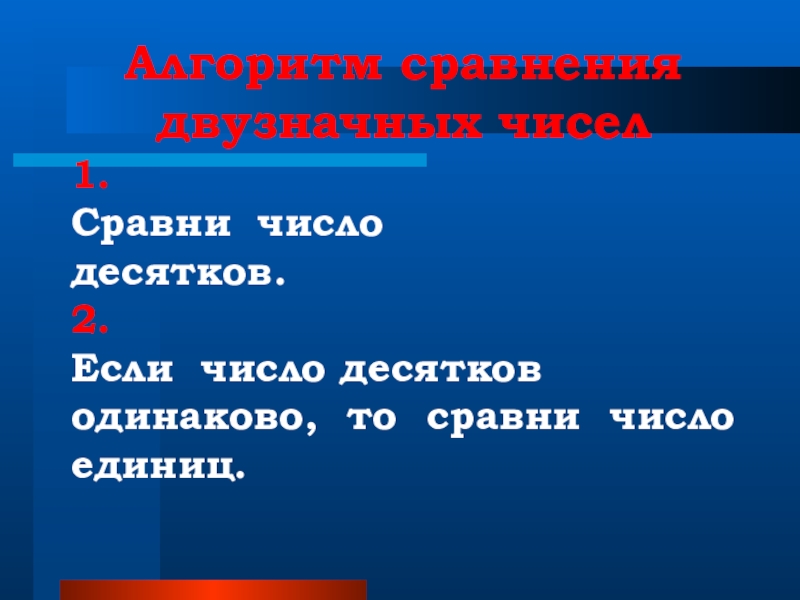 Алгоритм сравнения двузначных чисел1.Сравни число десятков.2. Если число десятков одинаково, то сравни число единиц.