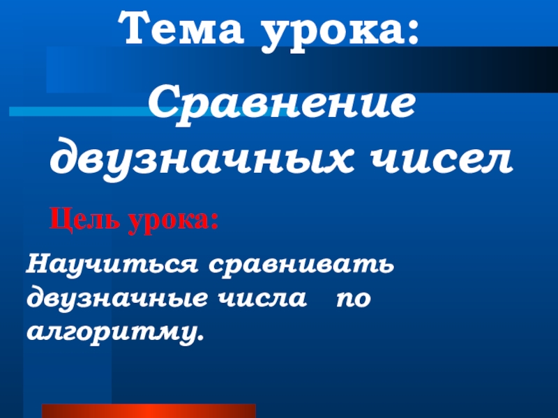 Тема урока:Научиться сравнивать двузначные числа  по алгоритму. Сравнение двузначных чиселЦель урока: