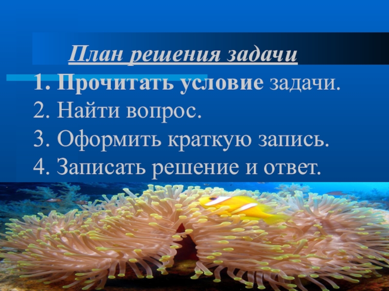 План решения задачи 1. Прочитать условие задачи. 2. Найти вопрос. 3. Оформить краткую