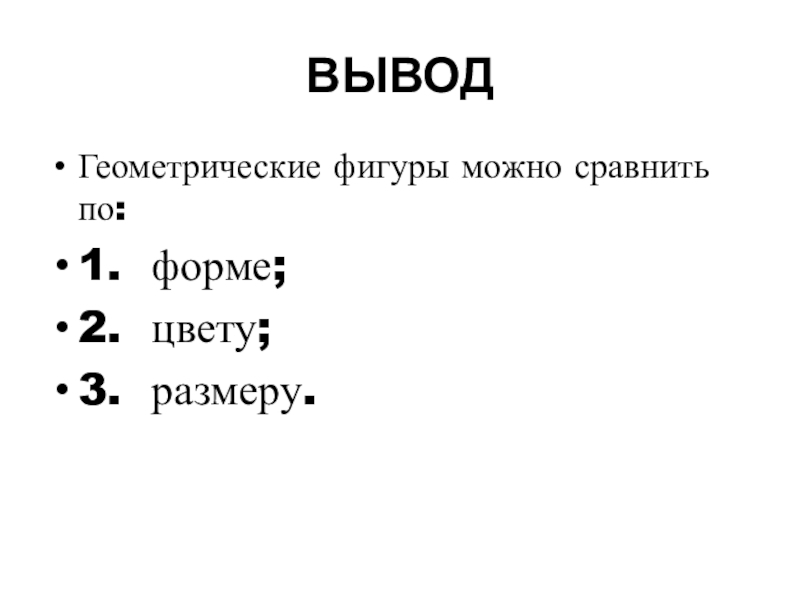 ВЫВОДГеометрические фигуры можно сравнить по:1. форме;2. цвету;3. размеру.