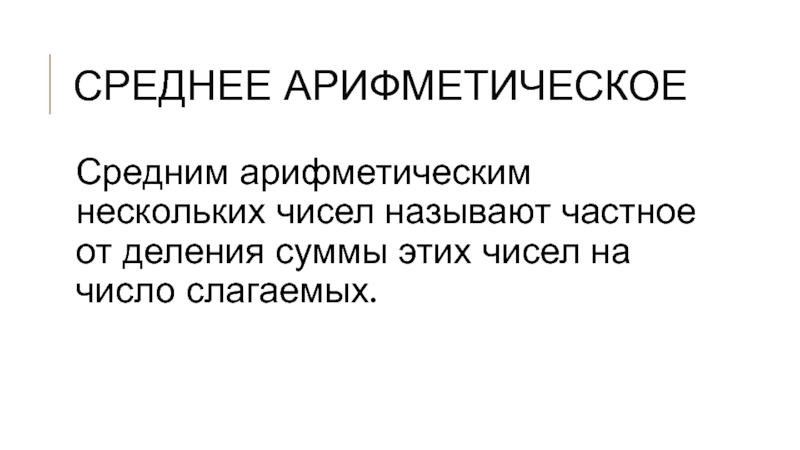 Среднее арифметическоеСредним арифметическим нескольких чисел называют частное от деления суммы этих чисел на число слагаемых.
