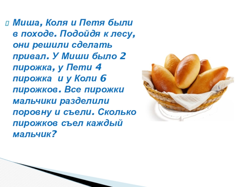 решили сделать привал. У Миши было 2 пирожка, у Пети 4 пирожка и у Коли 6 пирожков. Все пирожки мальчики разделили поровну и съели. Сколько пирожков съел каждый мальчик?