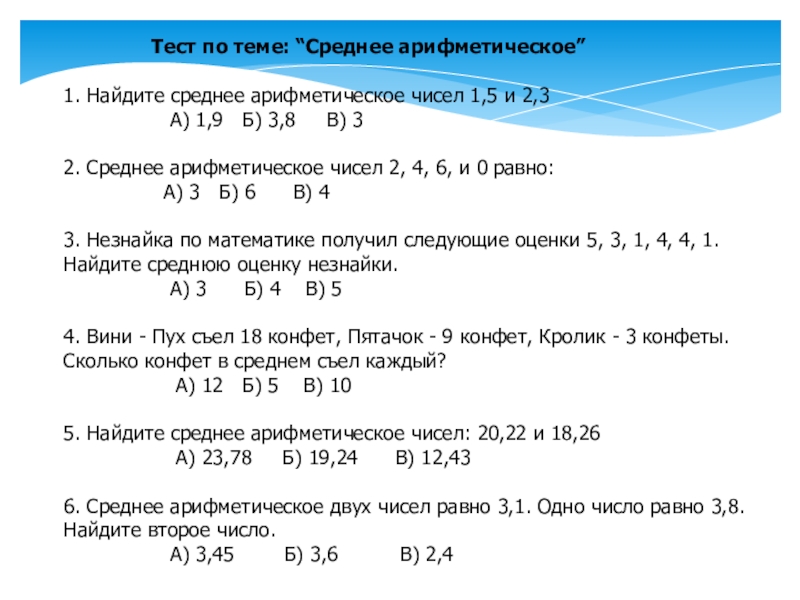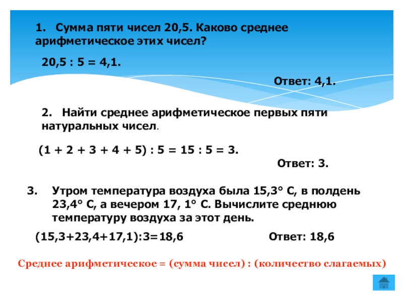 1. Сумма пяти чисел 20,5. Каково среднее арифметическое этих чисел?