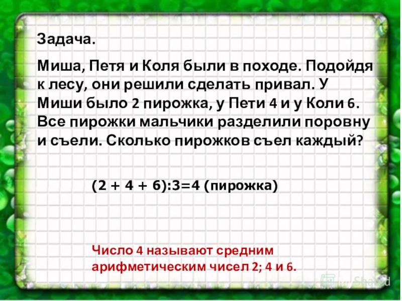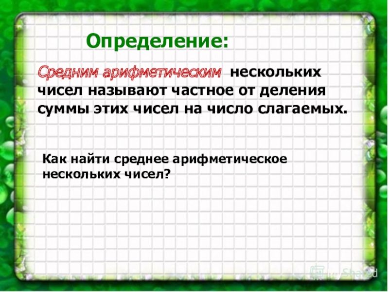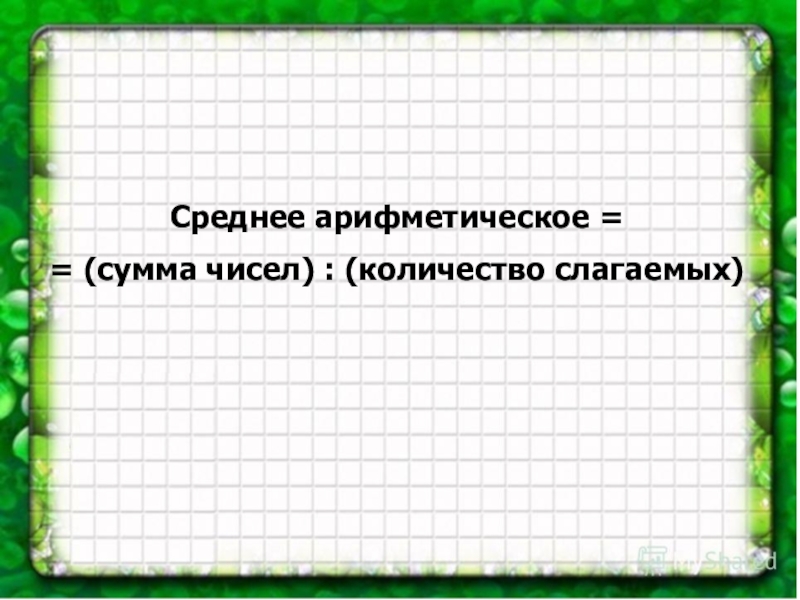 Среднее арифметическое = (сумма чисел) : (количество слагаемых)