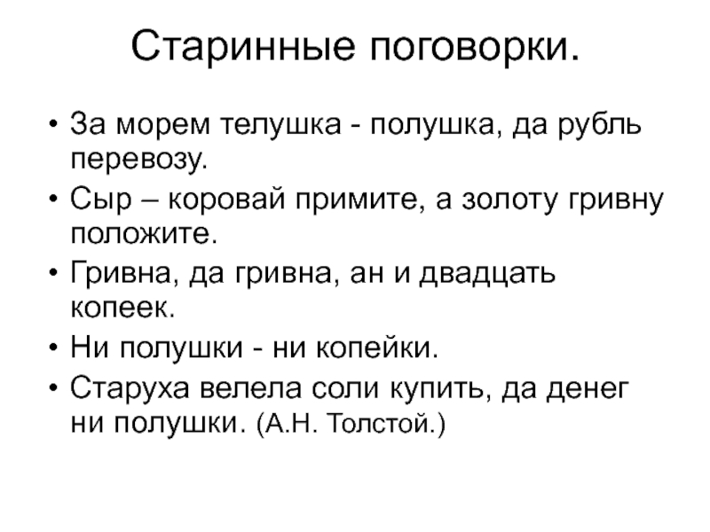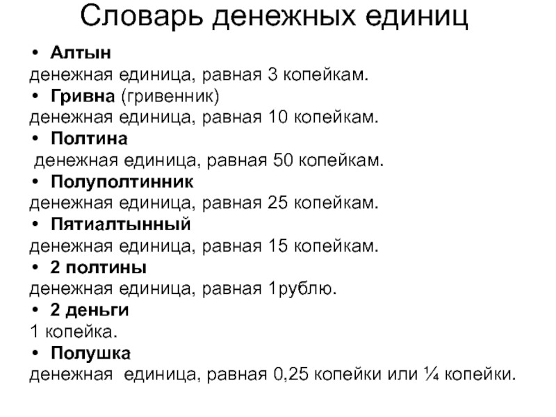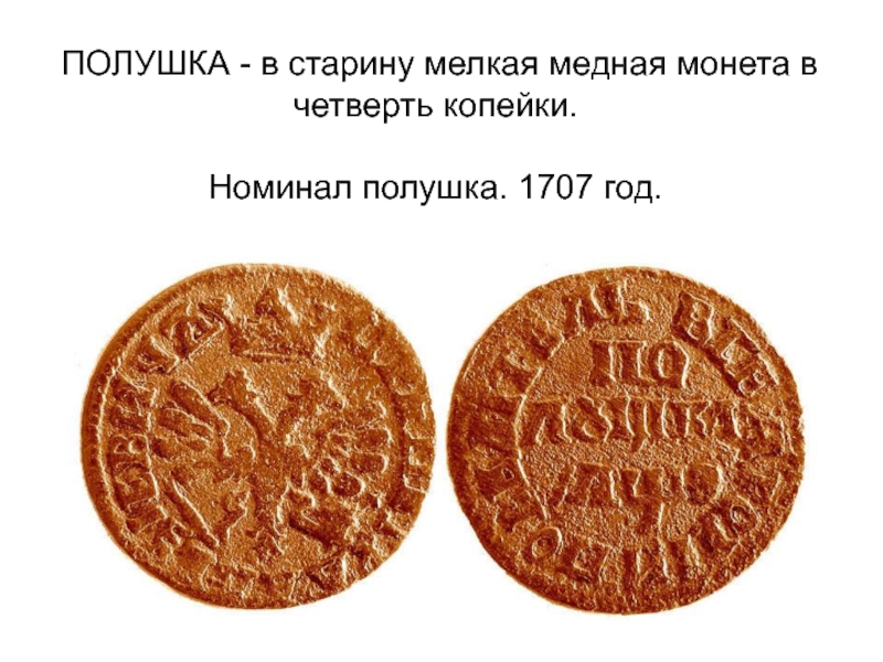 Слайд 14 ПОЛУШКА - в старину мелкая медная монета в четверть копейки.