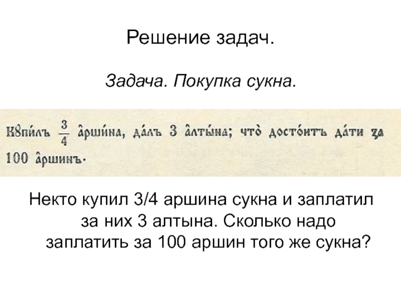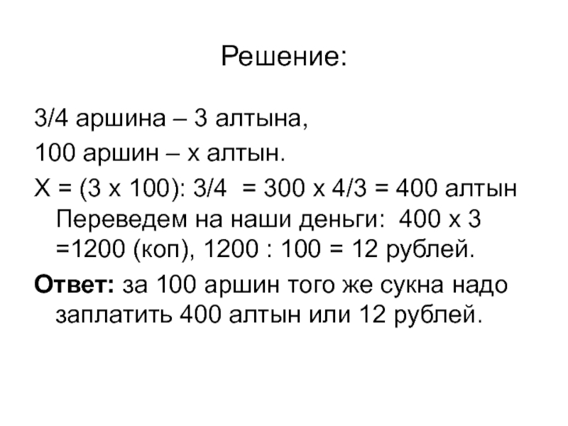 Ответ: за 100 аршин того же сукна надо заплатить 400 алтын или 12 рублей.