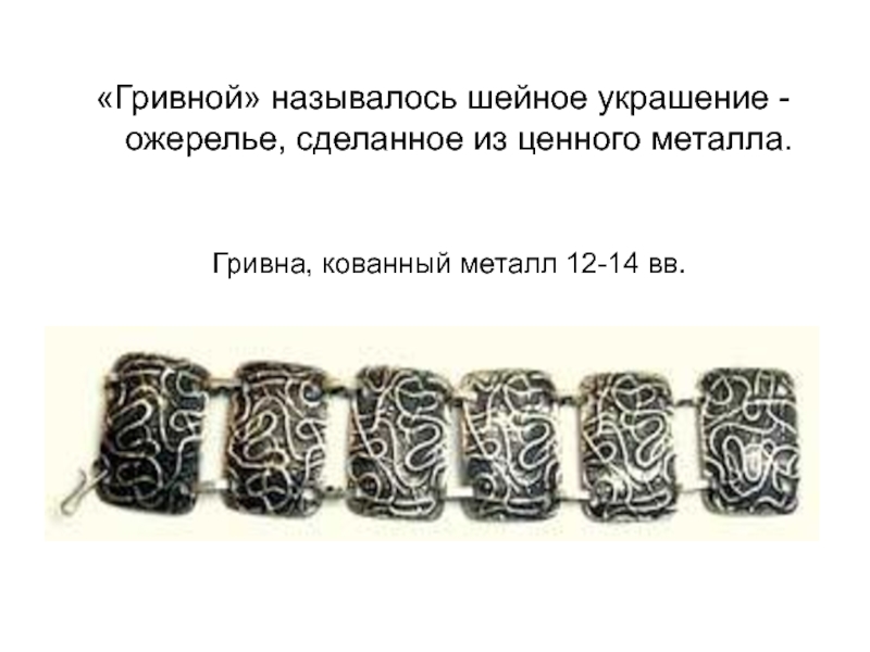 Слайд 10«Гривной» называлось шейное украшение - ожерелье, сделанное из ценного металла.