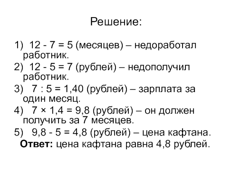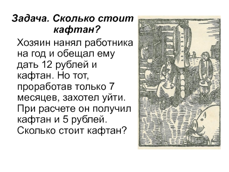 обещал ему дать 12 рублей и кафтан. Но тот, проработав только 7 месяцев, захотел уйти. При расчете он получил кафтан и 5 рублей. Сколько стоит кафтан?