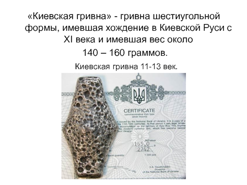 Слайд 11«Киевская гривна» - гривна шестиугольной формы, имевшая хождение в Киевской Руси