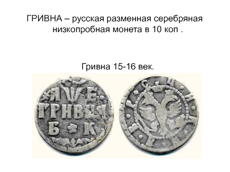 Слайд 9 ГРИВНА – русская разменная серебряная низкопробная монета в 10 коп