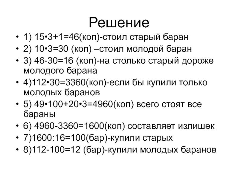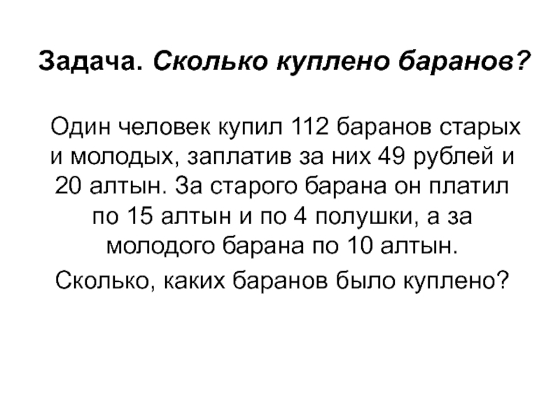 купил 112 баранов старых и молодых, заплатив за них 49 рублей и 20 алтын. За старого барана он платил по 15 алтын и по 4 полушки, а за молодого барана по 10 алтын.