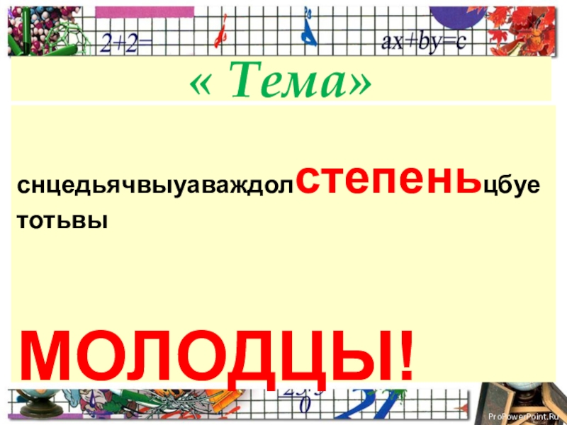 Это сайт презентаций, где можно хранить и обмениваться своими презентациями, докладами, проектами, шаблонами в формате PowerPoint с другими пользователями. Мы помогаем школьникам, студентам, учителям, преподавателям хранить и обмениваться учебными материалами.