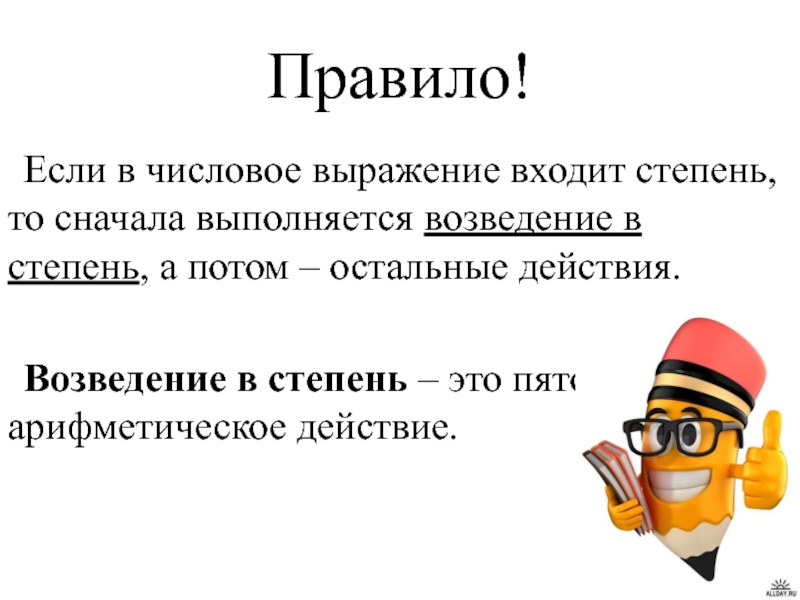 Правило!Если в числовое выражение входит степень, то сначала выполняется возведение в степень, а потом – остальные действия.