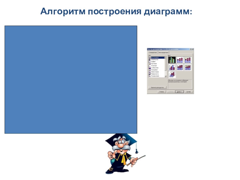 Алгоритм построения диаграмм:  1.Заполнить таблицу данных.2.Выделить ее. 3. Подвести указатель мышки к  кнопке «Мастер диаграмм»