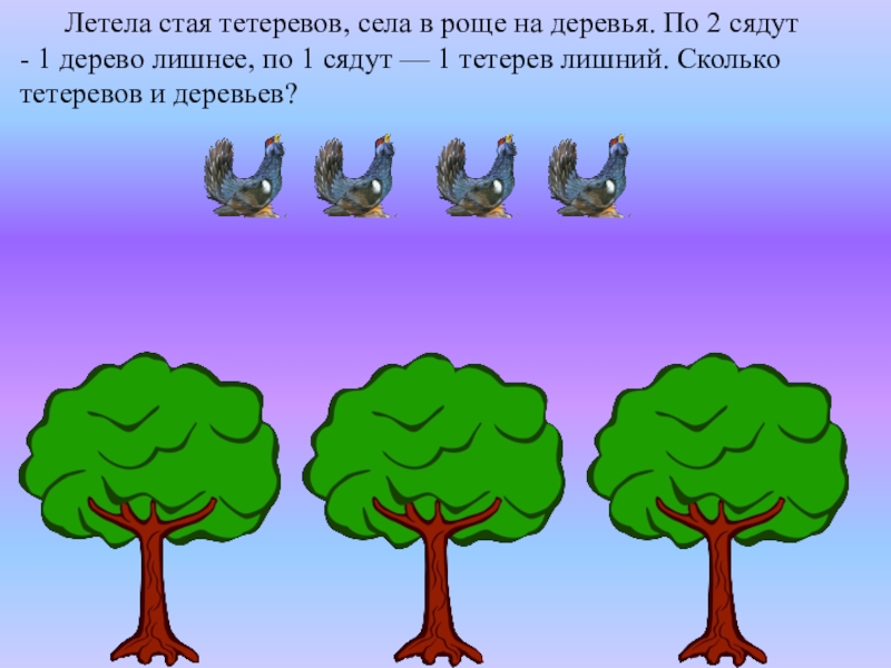 - 1 дерево лишнее, по 1 сядут — 1 тетерев лишний. Сколько тетеревов и деревьев?