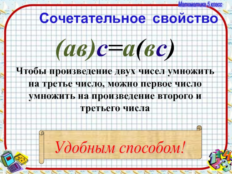 Чтобы произведение двух чисел умножить на третье число, можно первое число умножить на произведение второго и третьего числа