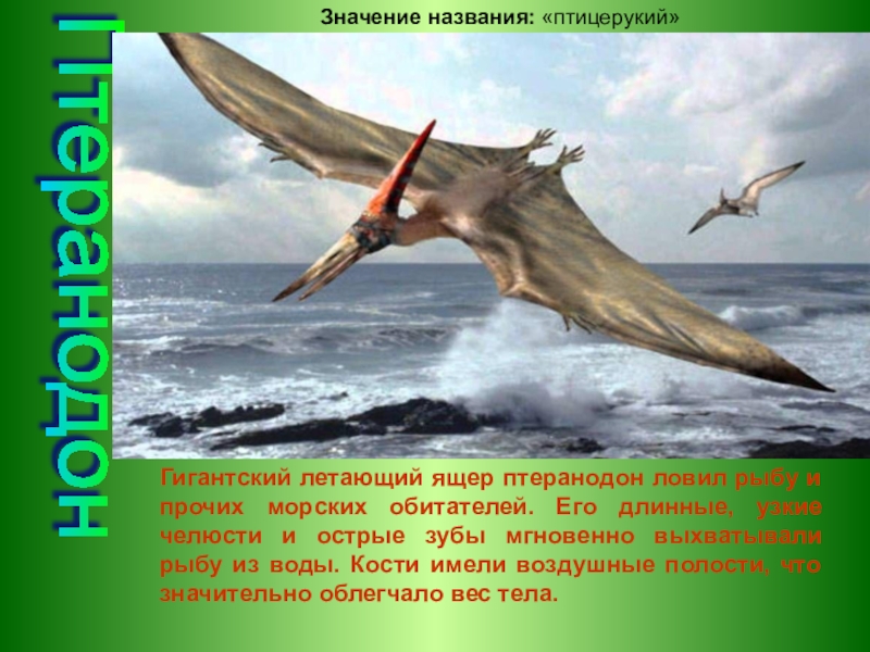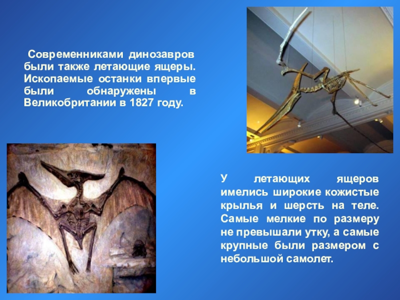 У летающих ящеров имелись широкие кожистые крылья и шерсть на теле. Самые мелкие по размеру не превышали утку, а самые крупные были размером с небольшой самолет.