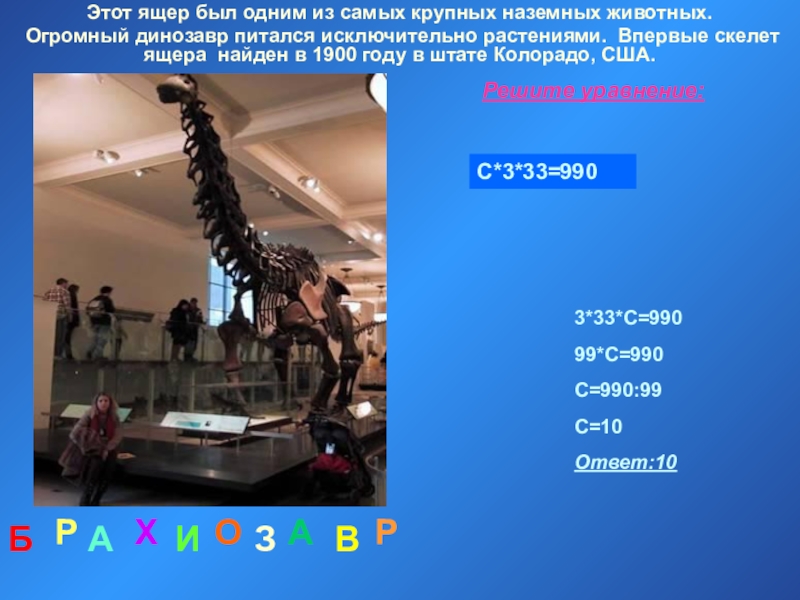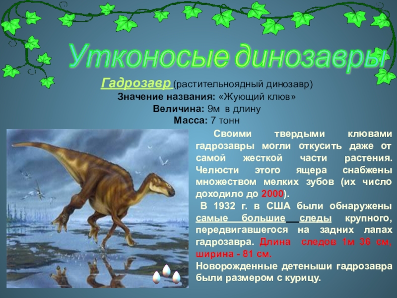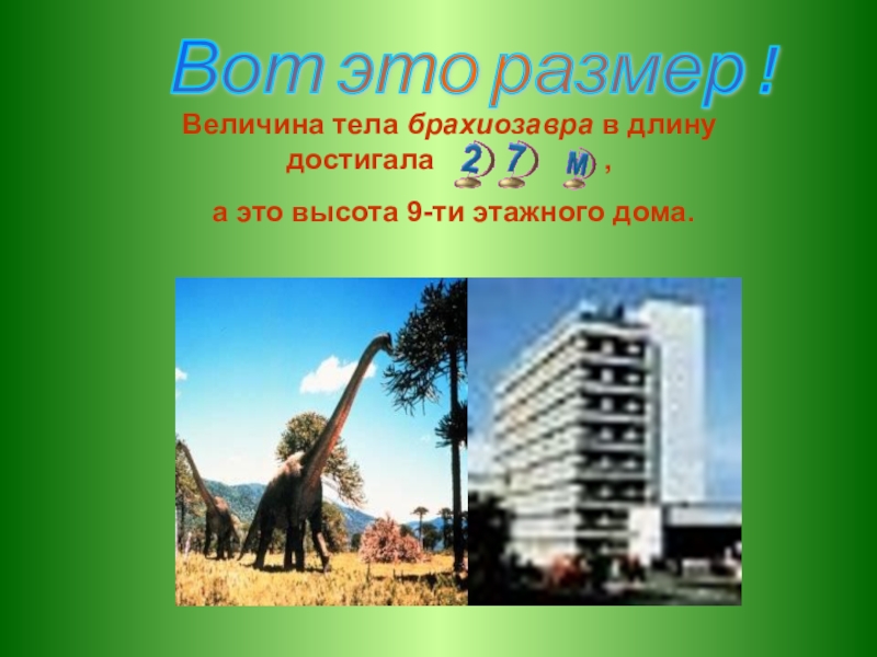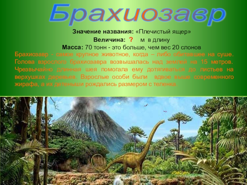 Брахиозавр - самое крупное животное, когда – либо обитавшее на суше. Голова взрослого брахиозавра возвышалась над землей на 15 метров. Чрезвычайно длинная шея помогала ему дотягиваться до листьев на верхушках деревьев. Взрослые особи были вдвое выше современного жирафа, а их детеныши рождались размером с теленка.