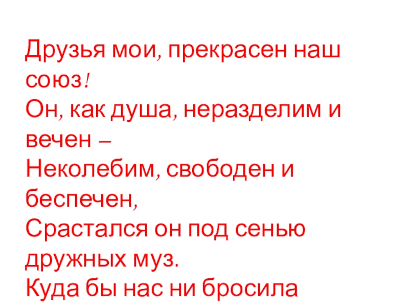 Друзья мои, прекрасен наш союз!Он, как душа, неразделим и вечен – Неколебим, свободен и беспечен,Срастался он под