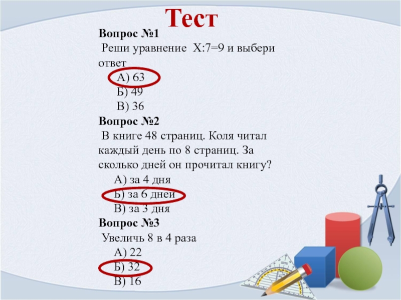 ТестВопрос №1 Реши уравнение Х:7=9 и выбери ответ   А) 63   Б) 49