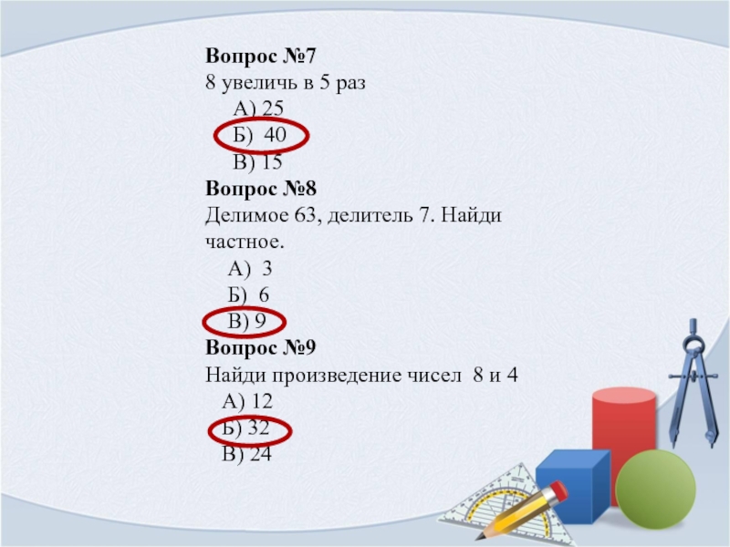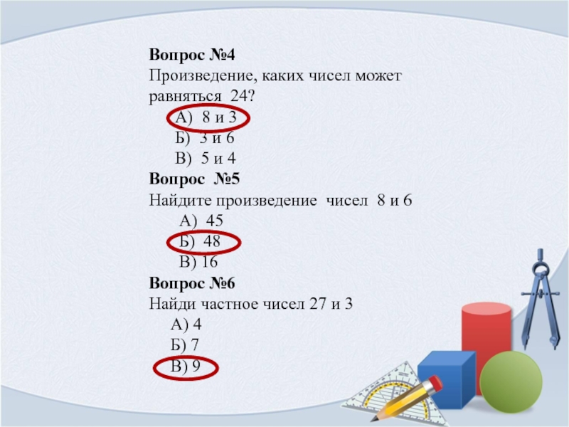 Вопрос №4Произведение, каких чисел может равняться 24?   А) 8 и 3   Б) 3
