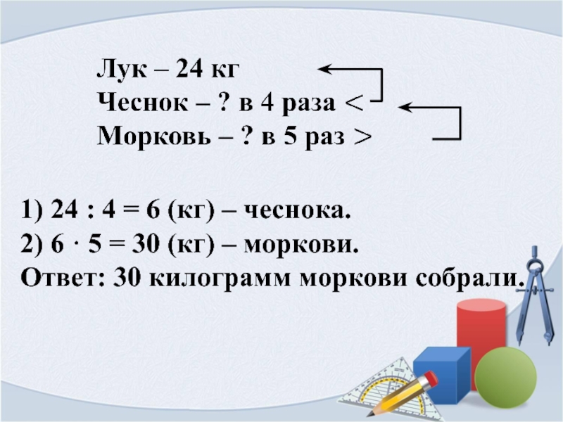 1) 24 : 4 = 6 (кг) – чеснока.2) 6 · 5 = 30 (кг) – моркови.Ответ: