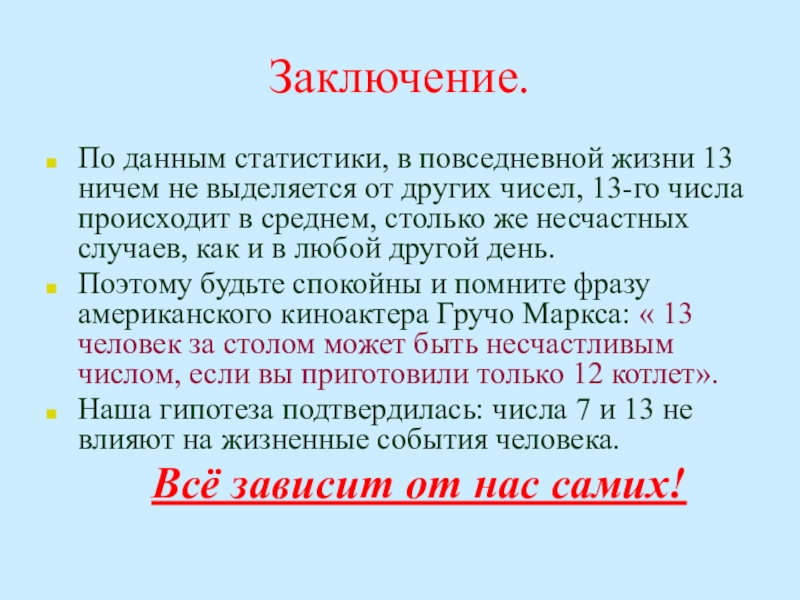 Эдгар Вундер, социолог, провел статистический анализ более чем 100 тысяч несчастных случаев за 14 лет, которые происходят по пятницам, 13-го числа. Выяснилось: никаких особых отличий «пятницы, 13» от других дней нет!