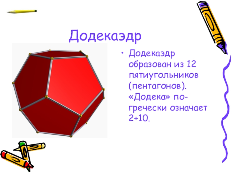 Додекаэдр образован из 12 пятиугольников (пентагонов). «Додека» по-гречески означает 2+10.