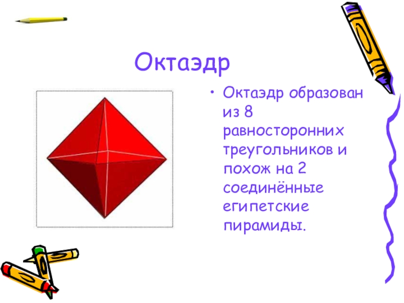 ОктаэдрОктаэдр образован из 8 равносторонних треугольников и похож на 2 соединённые египетские пирамиды.