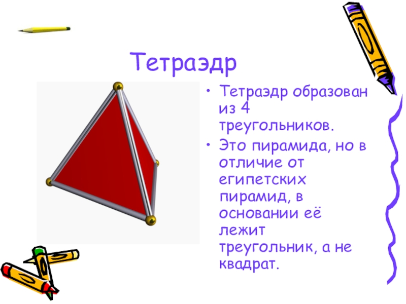 ТетраэдрТетраэдр образован из 4 треугольников.Это пирамида, но в отличие от египетских пирамид, в основании её лежит треугольник,