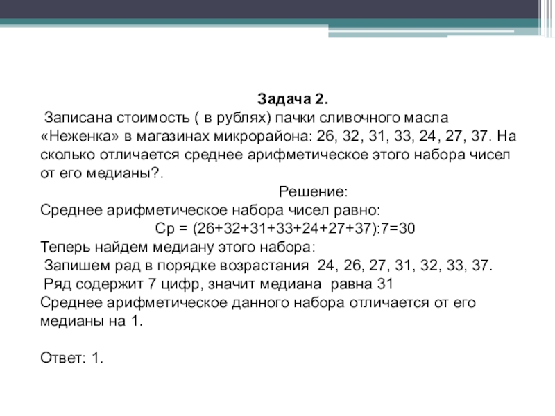 Записана стоимость ( в рублях) пачки сливочного масла «Неженка» в магазинах микрорайона: 26, 32, 31, 33, 24, 27, 37. На сколько отличается среднее арифметическое этого набора чисел от его медианы?.