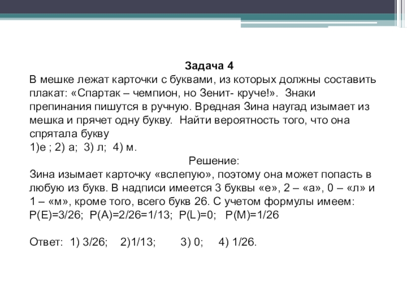 Зина изымает карточку «вслепую», поэтому она может попасть в любую из букв. В надписи имеется 3 буквы «е», 2 – «а», 0 – «л» и 1 – «м», кроме того, всего букв 26. С учетом формулы имеем: