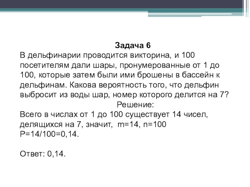 В дельфинарии проводится викторина, и 100 посетителям дали шары, пронумерованные от 1 до 100, которые затем были ими брошены в бассейн к дельфинам. Какова вероятность того, что дельфин выбросит из воды шар, номер которого делится на 7?
