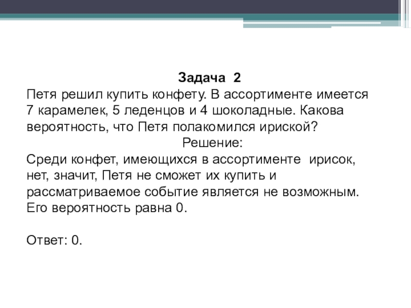 Среди конфет, имеющихся в ассортименте ирисок, нет, значит, Петя не сможет их купить и рассматриваемое событие является не возможным.