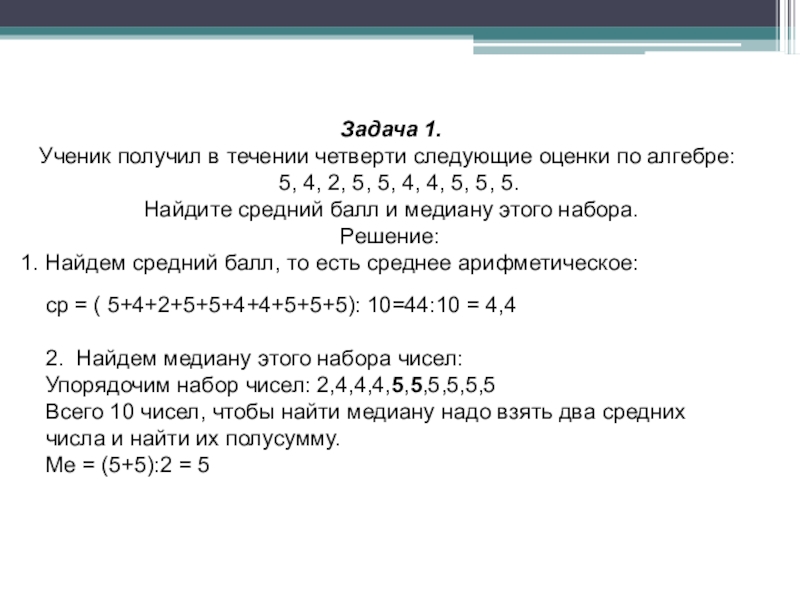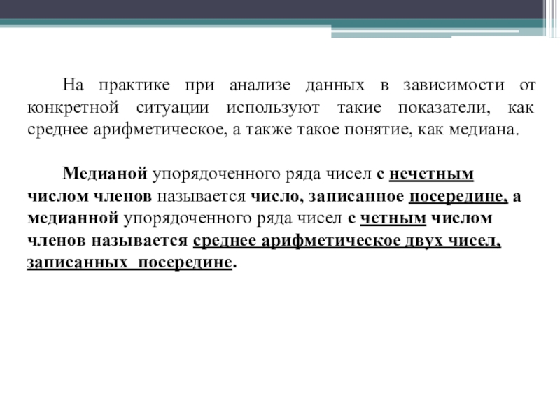 Медианой упорядоченного ряда чисел с нечетным числом членов называется число, записанное посередине, а медианной упорядоченного ряда чисел с четным числом членов называется среднее арифметическое двух чисел, записанных посередине.