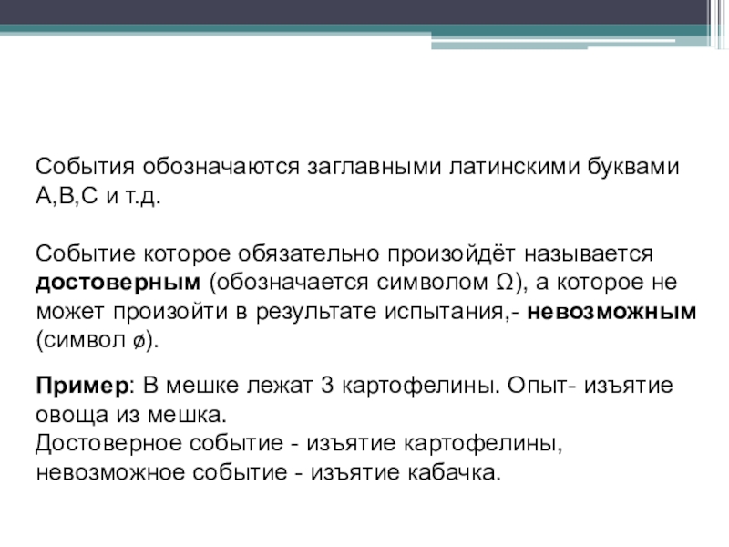 Событие которое обязательно произойдёт называется достоверным (обозначается символом Ω), а которое не может произойти в результате испытания,- невозможным (символ ø).