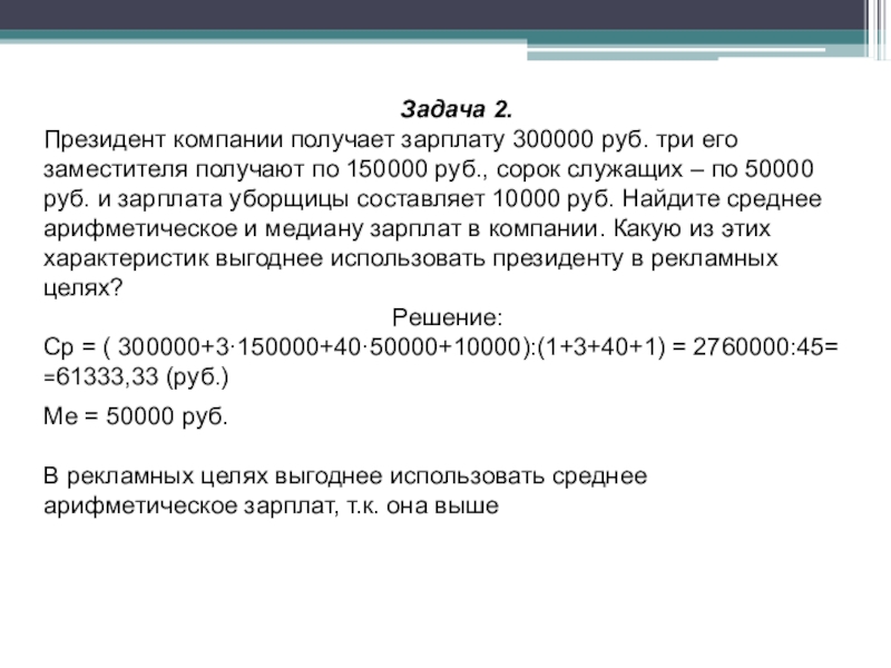 Президент компании получает зарплату 300000 руб. три его заместителя получают по 150000 руб., сорок служащих – по 50000 руб. и зарплата уборщицы составляет 10000 руб. Найдите среднее арифметическое и медиану зарплат в компании. Какую из этих характеристик выгоднее использовать президенту в рекламных целях?