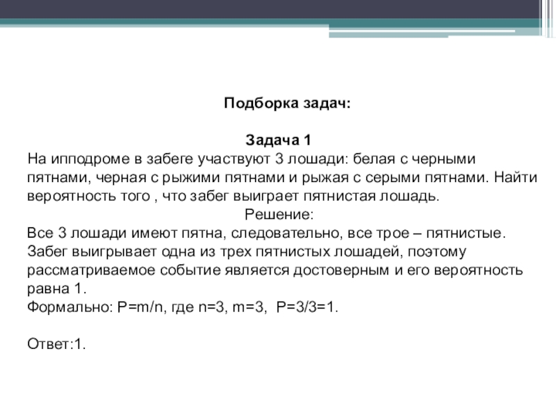 Все 3 лошади имеют пятна, следовательно, все трое – пятнистые. Забег выигрывает одна из трех пятнистых лошадей, поэтому рассматриваемое событие является достоверным и его вероятность равна 1.