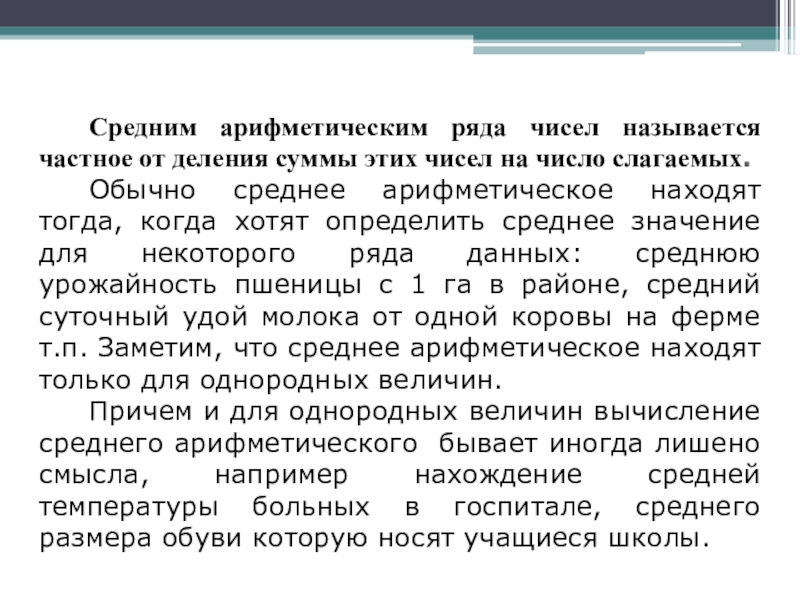 Обычно среднее арифметическое находят тогда, когда хотят определить среднее значение для некоторого ряда данных: среднюю урожайность пшеницы с 1 га в районе, средний суточный удой молока от одной коровы на ферме т.п. Заметим, что среднее арифметическое находят только для однородных величин.