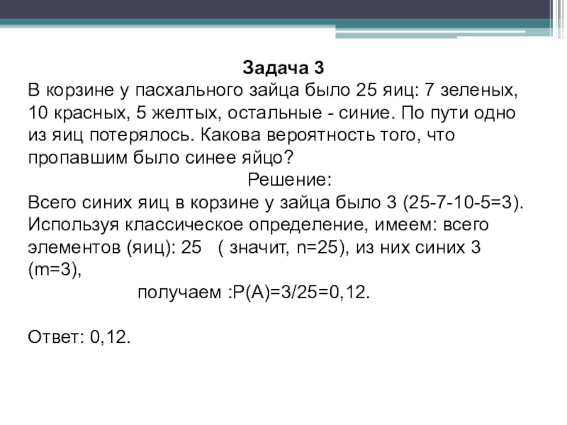 Используя классическое определение, имеем: всего элементов (яиц): 25 ( значит, n=25), из них синих 3 (m=3),