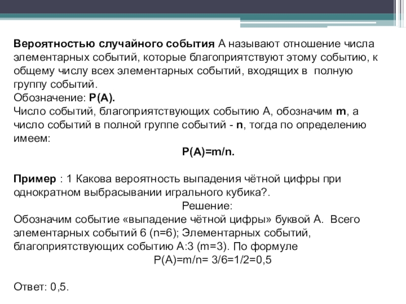 Пример : 1 Какова вероятность выпадения чётной цифры при однократном выбрасывании игрального кубика?.