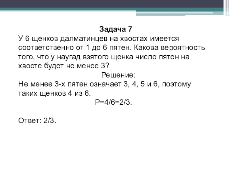 У 6 щенков далматинцев на хвостах имеется соответственно от 1 до 6 пятен. Какова вероятность того, что у наугад взятого щенка число пятен на хвосте будет не менее 3?